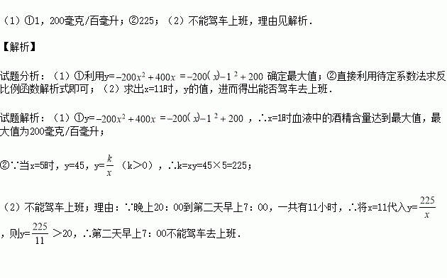 (2)按国家规定,车辆驾驶人员血液中的酒精含量大于或等于20毫克/百毫升时属于“酒后驾驶”,不能驾车上路.参照上述数学模型,假设某驾驶员晚上20:00在家喝完半斤低度白酒,第二天早上7:00能否驾车去上班?请说明理由.
