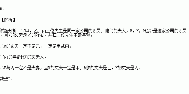 甲,乙,丙三位先生是同一家公司的职员,他们的夫人,M,N,P也都是这家公司的职员,知情者介绍说:“M的丈夫是乙的好友,并在三位先生中最年轻;丙的年龄比P的丈夫大”.根据该知情者提供的信息,我们可以推出三对夫妇分别是( )