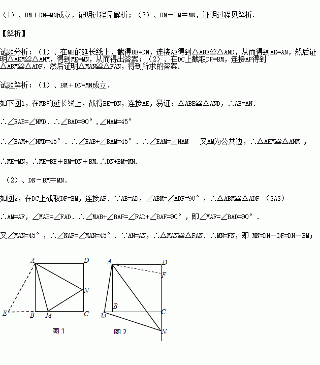 ÒÑÖªÕý·½ÐÎABCDÖУ¬¡ÏMAN=45¡ã£¬¡ÏMANÈÆµãA˳ʱÕëÐýת£¬ËüµÄÁ½±ß·Ö±ð½»CB¡¢DC£¨»òËüÃǵÄÑÓ³¤Ïߣ©ÓÚµãM¡¢N.µ±¡ÏMANÈÆµãAÐýתµ½BM=DNʱ£¨Èçͼ1£©£¬Ò×Ö¤BM£«DN£½MN£®