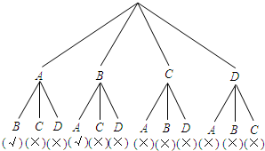 (4)设小明和小亮分别用A、B表示,另外两个同学用C、D表示,列树状图如下: