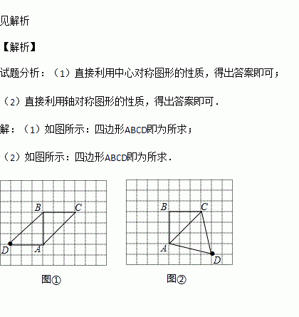 (2)请在图形②中取一点D(点D必须在小正方形的顶点上),使以A、B、C、D为顶点的四边形是轴对称图形,但不是中心对称图形.