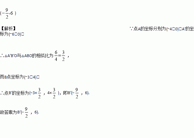 如图,平面直角坐标系xOy中,点A、B的坐标分别为(-4,0)、(-3,4),△A′B′O是△ABO关于的O的位似图形,且A′的坐标为(﹣6,0),则点B′的坐标为______.