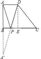 解:延长AB到A′,使得A′B=AB,连接A′D交BC于P,此时PA+PD最小,