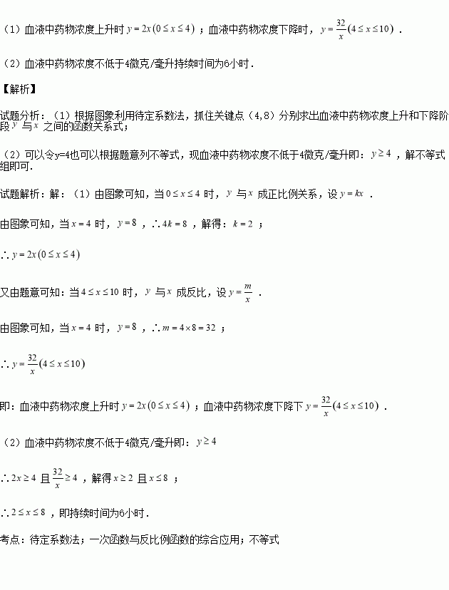 (1)根据图象分别求出血液中药物浓度上升和下降阶段