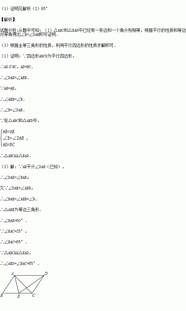 如图,在平行四边形ABCD中,E为BC边上一点,且AB=AE.