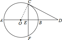 分析 连接OC,由DC切⊙O于点C,得到∠OCD=90°,由于BD=OB,得到OB=$\frac{1}{2}$OD,根据直角三角形的性质得出∠D=30°,∠COD=60°,根据垂径定理即可得到结论.