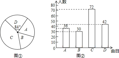 某校学生会计划在“五•一”前夕举行班级歌咏比赛,要确定一首喜欢人数最多的歌曲为每班必唱歌曲.为此提供代号为A、B、C、D四首备选曲目让学生选择,经过抽样调查,并将采集的数据绘制如图所示的两幅不完整的统计图.请根据图①、图②所提供的信息,解答下列问题: