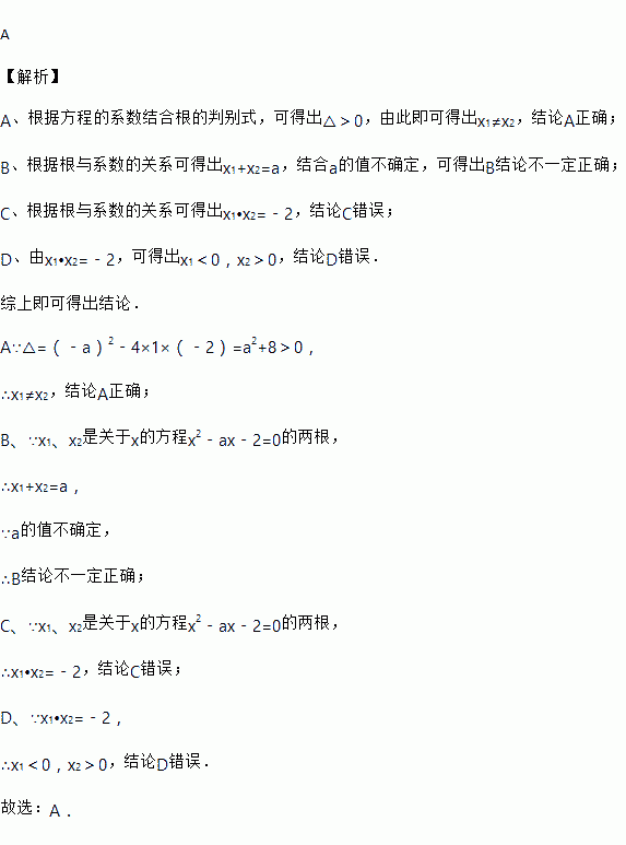 已知x1、x2是关于x的方程x2﹣ax﹣2=0的两根,下列结论一定正确的是( )