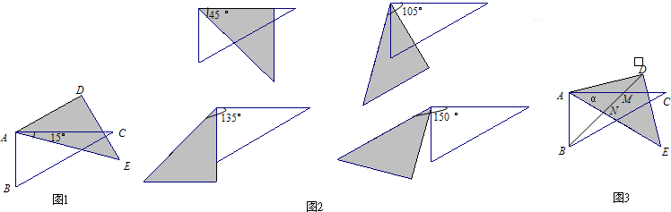 (2)当△ADE的一边与△ABC的某一边平行(不共线)时,旋转角α的所有可能的度数是:15°,45°,105°,135°,150°;