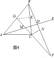 (3)作GK⊥BC于K,证明AM=AG,根据△MAC≌△NBC,得到∠BDA=90°,根据直角三角形的性质和已知条件求出AG的长,得到答案.