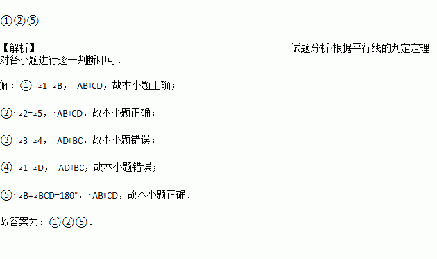 如图,现给出下列条件:①∠1=∠B,②∠2=∠5,③∠3=∠4,④∠1=∠D,⑤∠B+∠BCD=180°,其中能够得到AB∥CD的条件是_______.