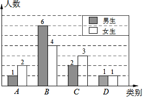 (2)用调查的学生总数乘以C类所占的百分比,再减去C类的男生数,从而求出C类的女生数;用调查的学生总数减去A、B、C类的学生数和D类的女生数,从而求出D类的男生数,即可补全统计图;
