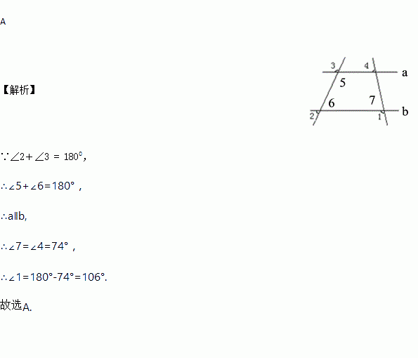 ∠2+∠3 = 1800,∠2 =680,∠4 = 740,则∠1的度数是( )