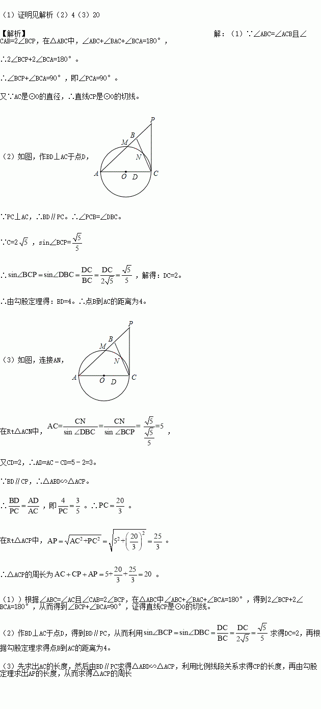 如图,在△ABC中,∠ABC=∠ACB,以AC为直径的⊙O分别交AB、BC于点M、N,点P在AB的延长线上,且∠CAB=2∠BCP.