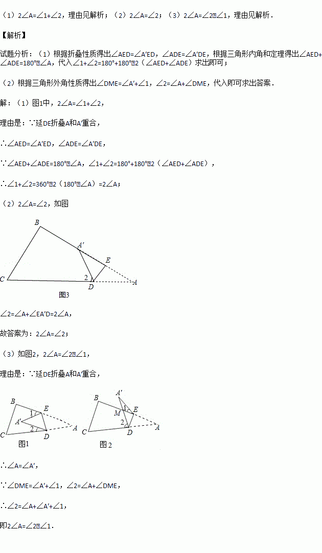 (3)如果A′落在四边形BCDE的外部(如图2),这时∠A′与∠1、∠2之间又存在怎样的数量关系?并说明理由.