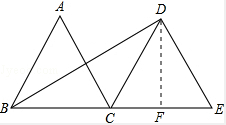 解答 解:过D作DF⊥CE于F,∵△DCE是边长为2的等边三角形,∴CF=1.∴DF2=3.∵△ABC是边长为2的等边三角形,∴BF=BC+CF=2+1=3,∴BD2=BF2+DF2=9+3=12,∴BD=$\sqrt{12}$=2$\sqrt{3}$.