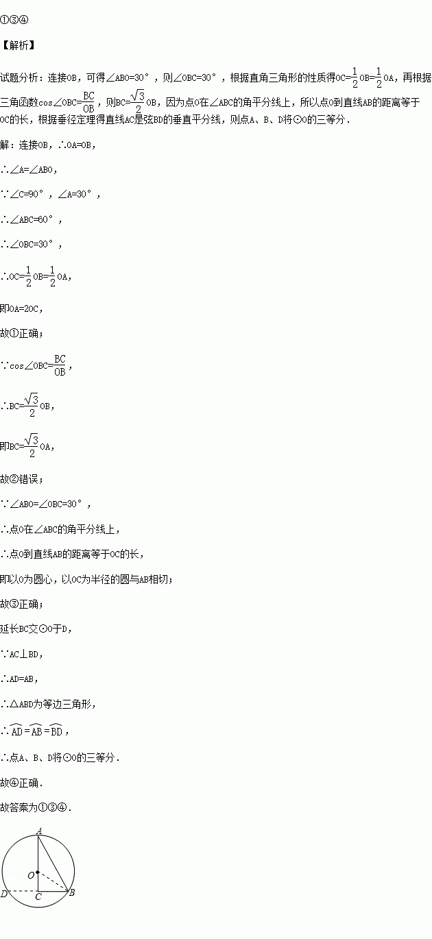 (2013•沁阳市一模)如图,Rt△ABC中,∠C=90°、∠A=30°,在AC边上取点O画圆,使⊙O经过A、B两点,下列结论正确的序号是 (多填或错填得0分,少填酌情给分).