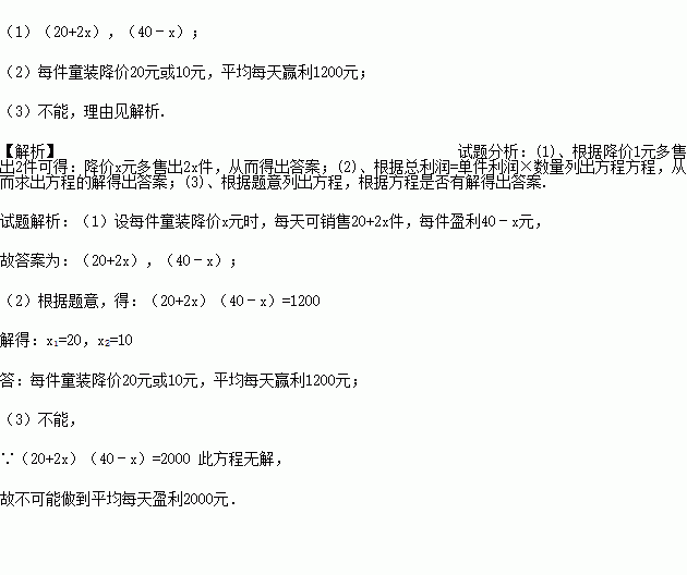 £¨1£©Éèÿ¼þͯװ½µ¼ÛxԪʱ£¬Ã¿Ìì¿ÉÏúÊÛ¡¡¡¡¼þ£¬Ã¿¼þÓ¯Àû¡¡¡¡Ôª£»£¨ÓÃxµÄ´úÊýʽ±íʾ£©