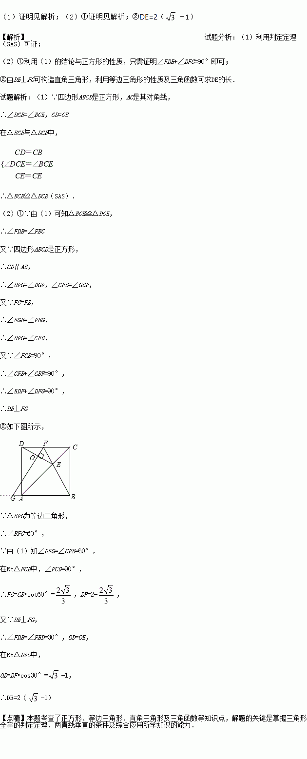 ②已知正方形ABCD的边长为2,若点E在对角线AC上移动,当△BFG为等边三角形时,求线段DE的长。
