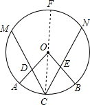 分析:连接OC并延长交⊙O于点F先根据OA,OB为半径,点D,E平分OA,OB得出OD=OE,再由SAS定理得出△OCD≌OCE,由全等三角形的性质得出∠MCF=∠NCF,故