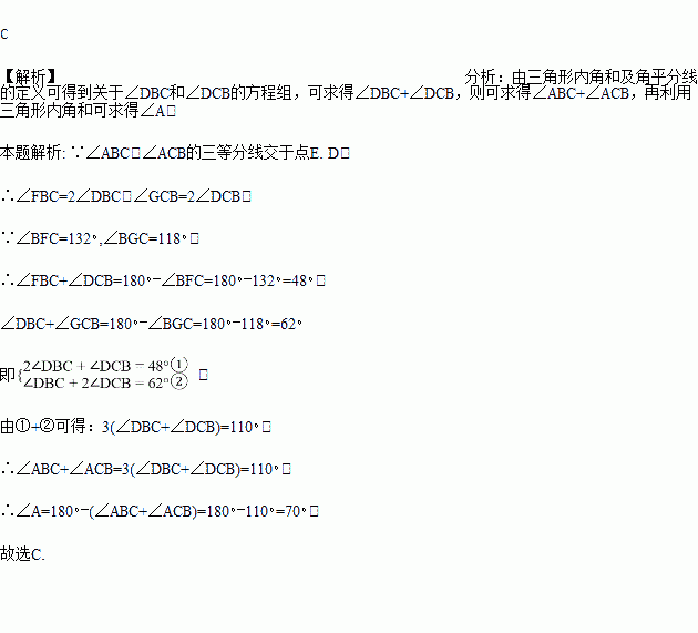 如图,△ABC, ∠ABC、∠ACB的三等分线交于点E、D,若∠BFC=132°,∠BGC=118°,则∠A的度数为( )