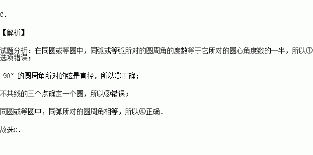 下列命题:①圆周角的度数等于圆心角度数的一半;②90°的圆周角所对的弦是直径;③三个点确定一个圆;④同圆或等圆中,同弧所对的圆周角相等.其中正确的是( )
