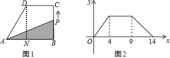 解答 解:根据图2可知当点P在CD上运动时,△ABP的面积不变,与△ABC面积相等;且不变的面积是在x=4,x=9之间;