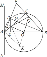 分析 (1)根据圆周角定理得到∠ADB=90°,而BA=BP,根据等腰三角形的性质得∠ABD=$\frac{1}{2}$∠ABP,加上∠PAM=$\frac{1}{2}$∠ABP,所以∠PAM=∠ABD,则利用∠ABD+∠BAD=90°可得∠PAM+∠BAD=90°,于是根据切线的判定定理可得直线MN是⊙O的切线;