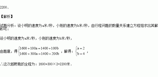 一次越野跑中,当小明跑了1600米时,小刚跑了1400米,小明、小刚在此后所跑的路程y(米)与时间t(秒)之间的函数关系如图所示,则这次越野跑的全程为 米