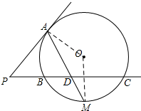 解答 解:连接AO、OM.∵M是弧BC的中点,∴OM⊥BC.∴∠ADP=∠CDM=90°-∠OMA.∵AP为圆的切线,∴OA⊥AP.∴∠PAD=90°-∠OAM.∵AO=OM,∴∠OAM=∠OMA.∴∠PAD=∠PDA.∴PA=PD.