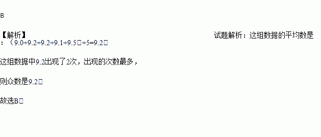 在“创卫生城市,创文明城市”演讲比赛中,5位评委给靓靓同学的评分如下:9.0,9.2,9.2,9.1,9.5,则这5个数据的平均数和众数分别是( )