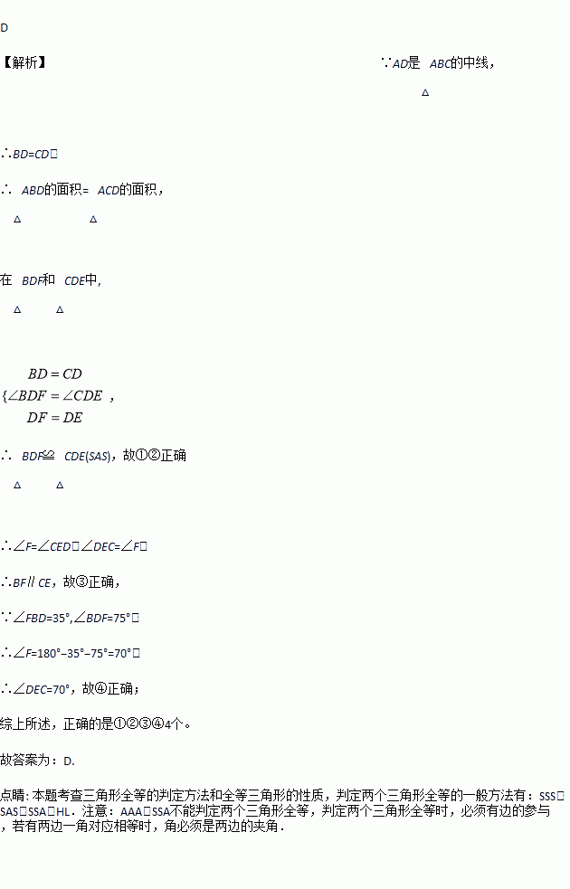 如图,AD是△ABC的中线,E,F分别是AD和AD延长线上的点,且DE=DF,连接BF、CE,且∠FBD=35°,∠BDF=75°,下列说法:①△BDF≌CDE;②ABD和△ACD面积相