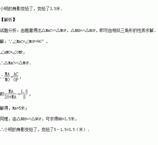 (2015秋•九江期末)如图,路灯(P点)距地面8米,身高1.6米的小明从距离路灯的底部(O点)20米的A点,沿OA所在的直线行走14米到B点(B点在A点的左边)时,身影的长度是变长了还是变短了?变长或变短了多少米?