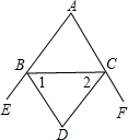 得∠1+∠2=(∠CBE+∠BCF),再根据平角的定义得出∠CBE+∠BCF=180°-∠ABC+180°-∠BCA,就可找到∠D和∠A的关系,从而求解.