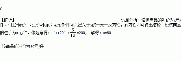 互联网“微商”经营已成为大众创业新途径,某微信平台上一件商品标价为200元,按标价的五折销售,仍可获利20元,则这件商品的进价为( )