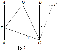 (2)延长AD到F,使DF=BE,连结CF,如图2,由(1)得△CBE≌△CDF,则CE=CF,∠1=∠2,S△BCE=S△CDF,利用∠1+∠DCE=90°可得∠2+∠DCE=90°,所以∠ECG=∠FCG=45°,则可利用“SAS”证明△CEG≌△CFG,则S△ECG=S△CFG,易得S△ECG=S△BCE+S△CDG.