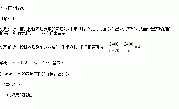 甲、乙两地间铁路长2400千米,经技术改造后,列车实现了提速.提速后比提速前速度增加20千米/时,列车从甲地到乙地行驶时间减少4小时.已知列车在现有条件下安全行驶的速度不超过140千米/时.请你用学过的数学知识说明这条铁路在现有条件下是否还可以再次提速?