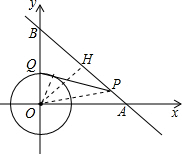 分析 先根据坐标轴上点的坐标特征确定B(0,4),A(4,0),则可判断△OAB为等腰直角三角形,所以AB=$\sqrt{2}$OA=4$\sqrt{2}$,OH=$\frac{1}{2}$AB=2$\sqrt{2}$,再根据切线的性质,由PQ为⊙O的切线得到OQ⊥PQ,根据勾股定理得到PQ=$\sqrt{O{P}^{2}-O{Q}^{2}}$=$\sqrt{O{P}^{2}-4}$,所以当OP最小时,PQ最小,根据垂线段最短得到OP=OH时,OP最小,即可计算出切线长PQ的最小值=2.