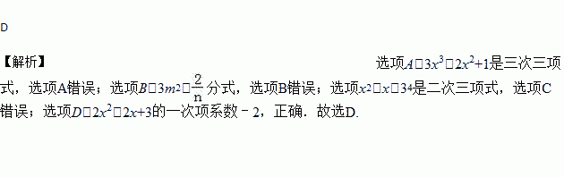 C. x2﹣x﹣34是四次三项式 D. 2x2﹣2x+3中一次项系数为﹣2