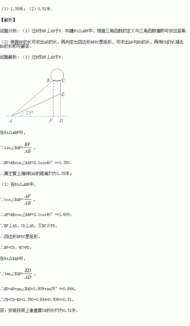 如图1是安装在斜屋面上的热水器,图2是安装该热水器的侧面示意图.已知,斜屋面的倾角为25°,长为2.1米的真空管AB与水平线AD的夹角为40°,安装热水器的铁架水平横管BC长0.2米.