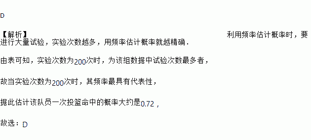 根据上表可知该队员一次投篮命中的概率大约是( )