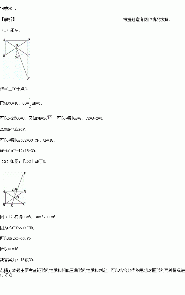在矩形ABCD中,对角线AC,BD相交于点O,AC+BD=40,AB=12,点E是BC边上一点,直线OE交CD边所在的直线于点F,若OE=2