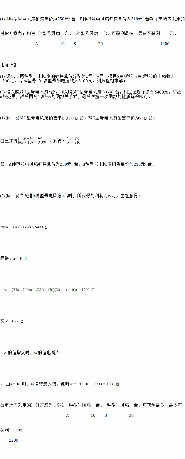 若该商场准备用不多于5400元的金额再采购这两种型号的电风扇共30台,假设售价不变,那么商场应采用哪种采购方案,才能使得当销售完这些风扇后,商场获利最多?最多可获利多少元?![]()
