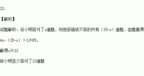 我校组织开展的环保知识竞赛,共有25道题,规定答对一题记4分,答错或不答一题扣1分.要使小明参加本次竞赛得分不低于85分,那么他至少要答对 道题.