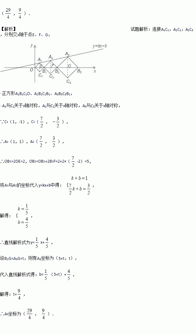中,正方形A1B1C1O、A2B2C2B1、A3B3C3B2,…, 按图所示的方式放置.点A1、A2、A3,…和点B1、B2、B3,…分别在直线