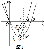 b:当m>3时,过Q作x轴的平行线交直线AK于E,如图2所示:![]()