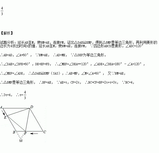 如图,在菱形ABCD中,AB=4cm,∠ADC=120°,点E、F同时由A、C两点出发,分别沿AB、CB方向向点B匀速移动(到点B为止),点E的速度为1cm/s,点F的速度为2cm/s,经过t秒△DEF为等边三角形,则t的值为 .