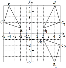∴点A(-2,1),B(-4,5),C(-5,2)关于y轴的对称点A2,B2,C2的坐标分别为:A2(2,-1),B1(4,-5),C1(5,-2);