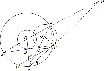 点评:此题主要考查了相交两圆的性质以及锐角三角函数的定义等知识,根据已知得出正确辅助线过C作CM∥AB交DE于N,进而得出四边形ONCB为平行四边形是解题关键.