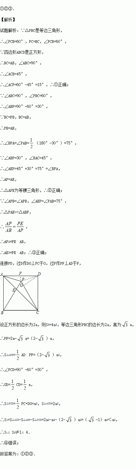 如图,点P在正方形ABCD内,△PBC是正三角形,AC与PB相交于点E.有以下结论:①∠ACP=15°;②△APE是等腰三角形;③AE2=PE